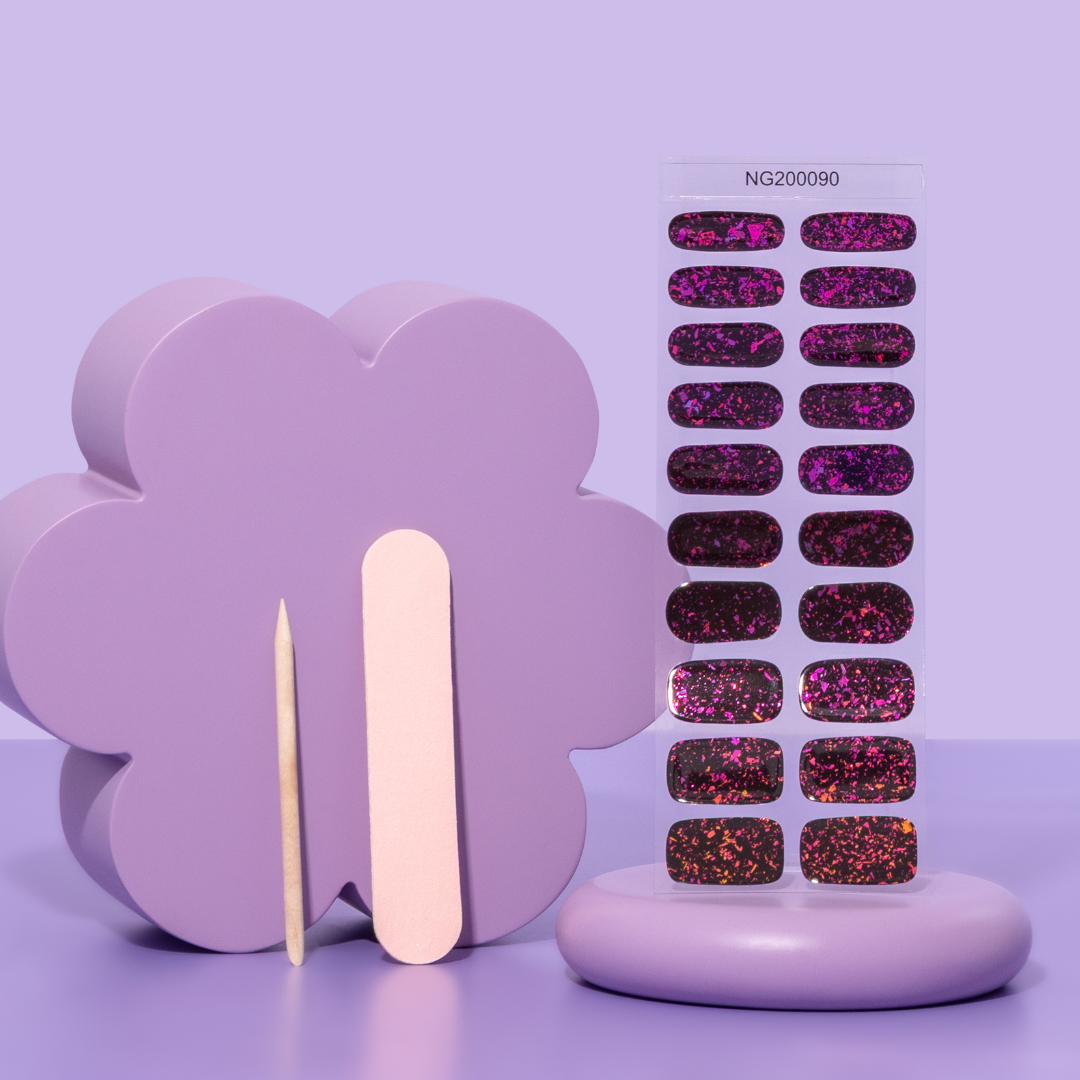 Nuestra amatista de medianoche Esta pegatina de gel semicurada para uñas pertenece a nuestra colección Speckled y se asemeja a un cuarzo amatista que brilla a medianoche. Las motas moradas se revelan al incidir la luz en las uñas.